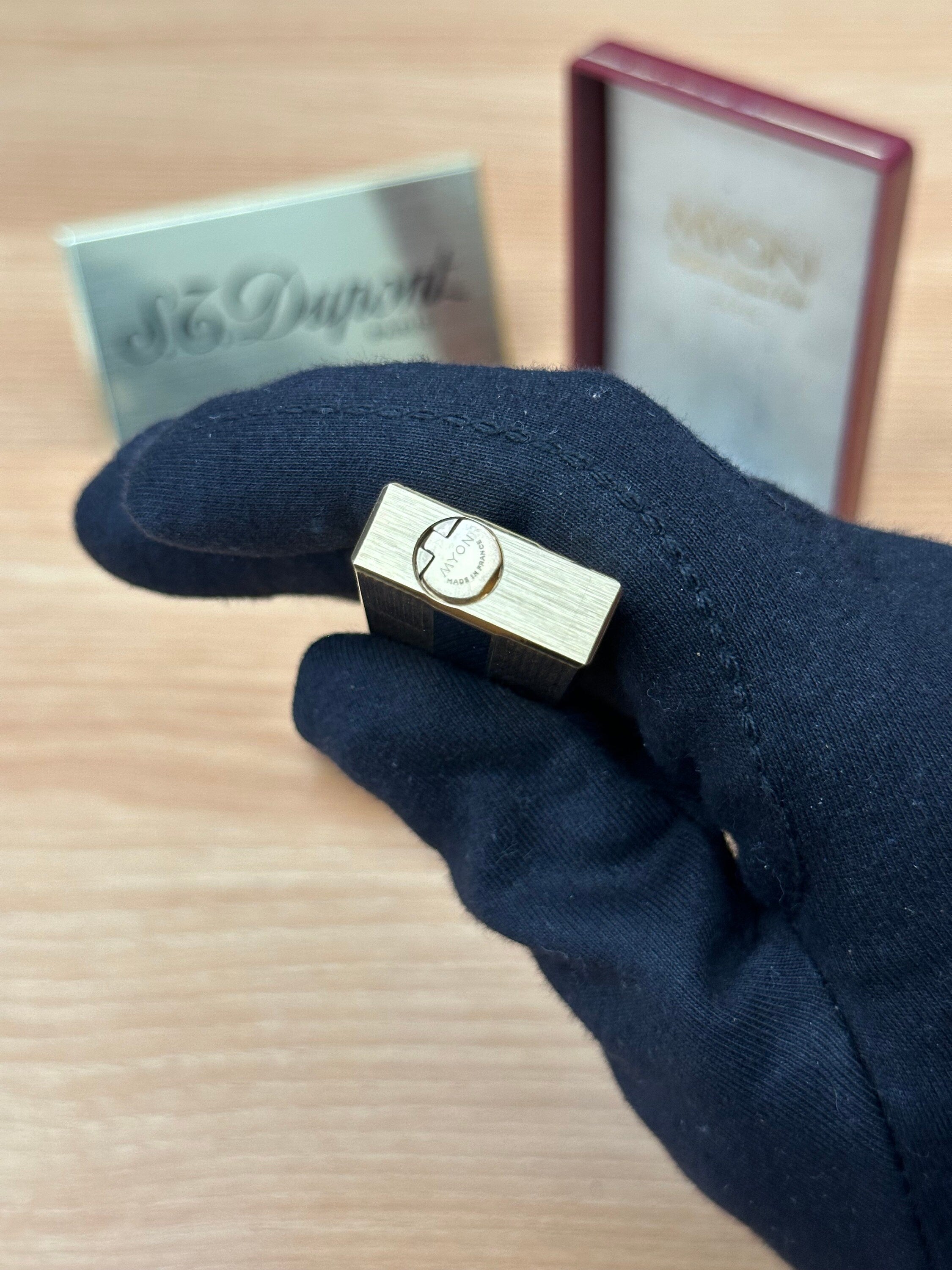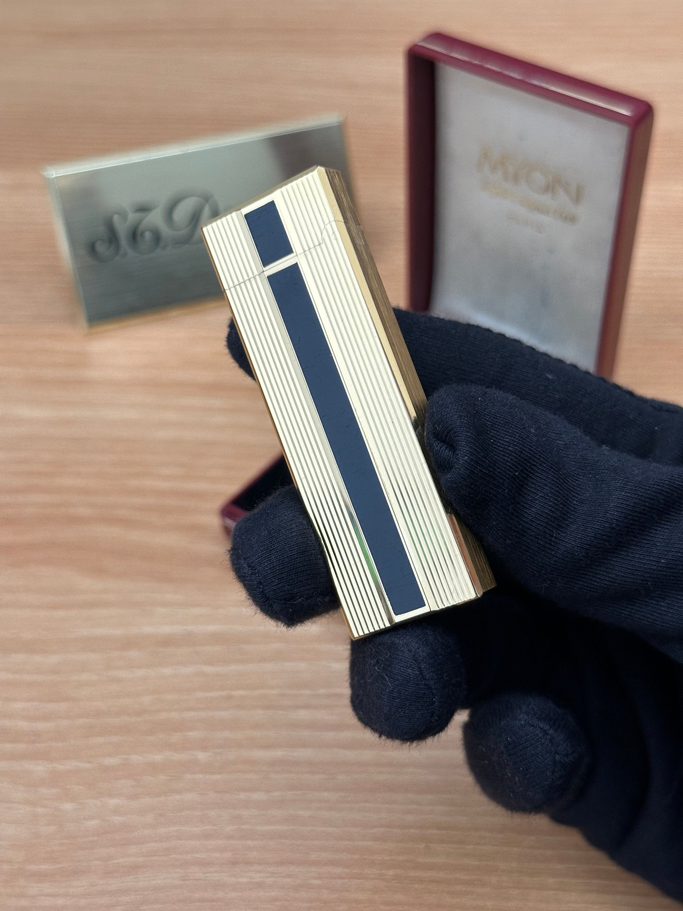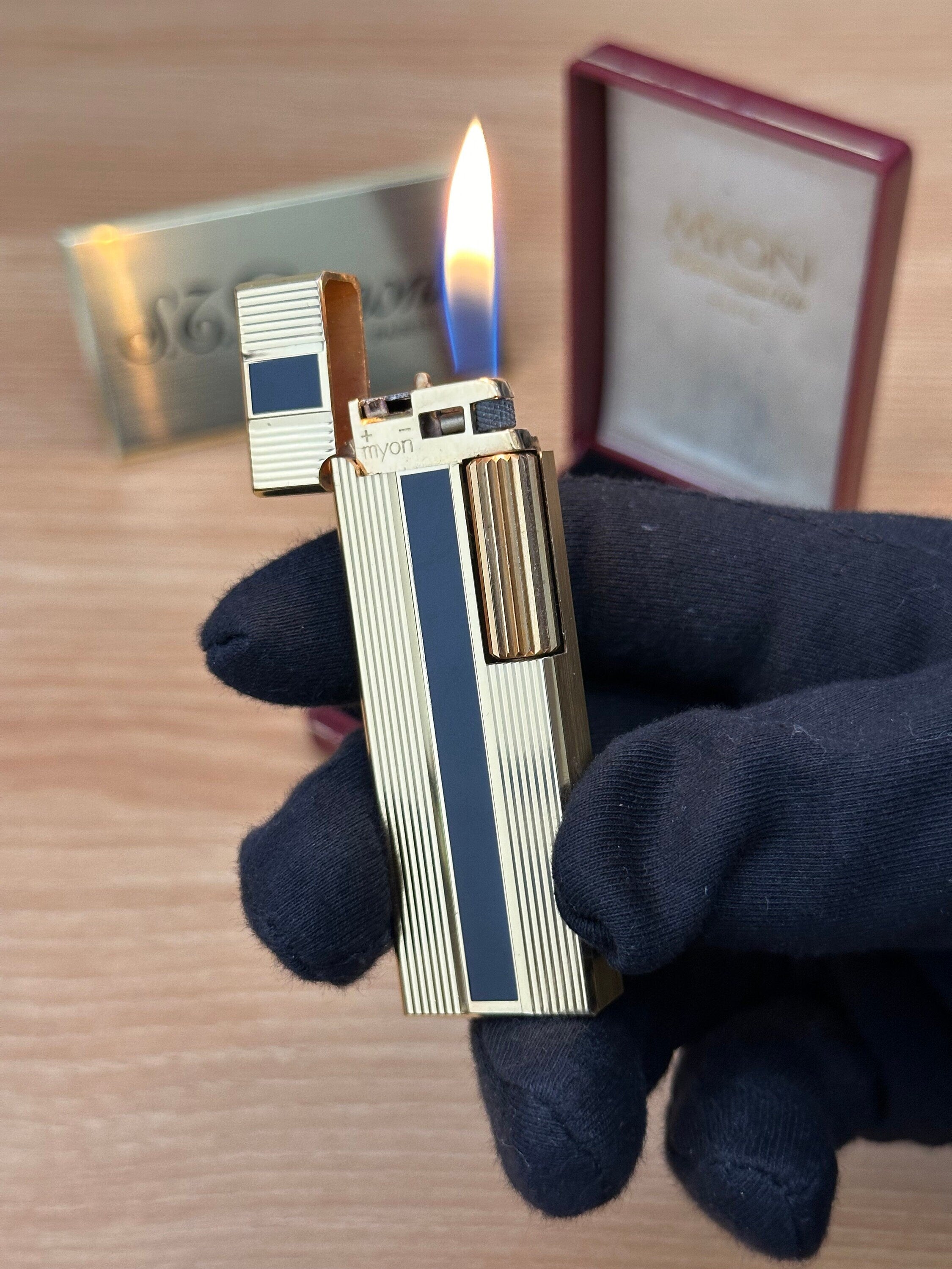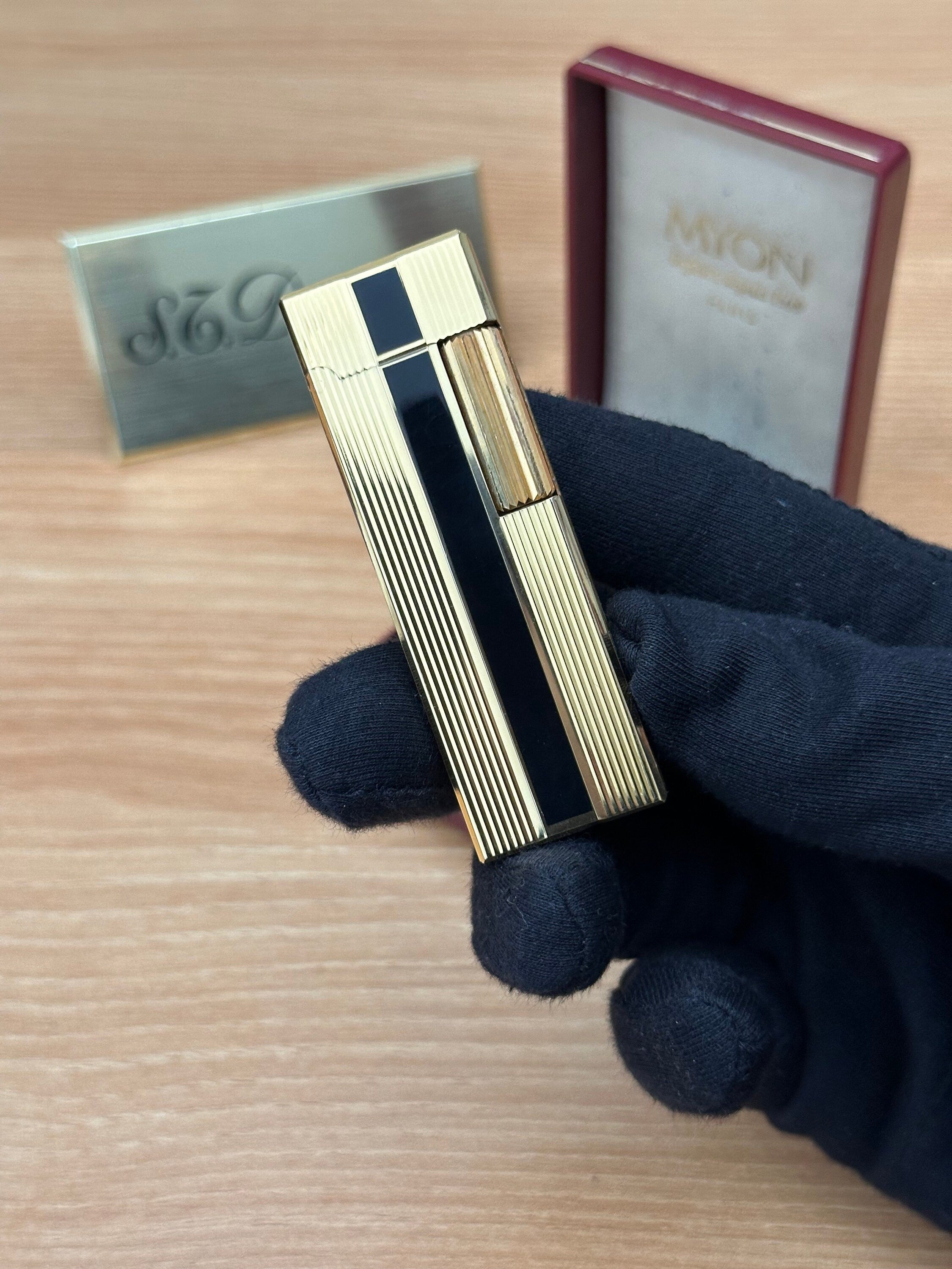 Vintage 1980 Myon Feuerzeug Paris Gold Finish Schwarzlack mit Box / mit Initiale